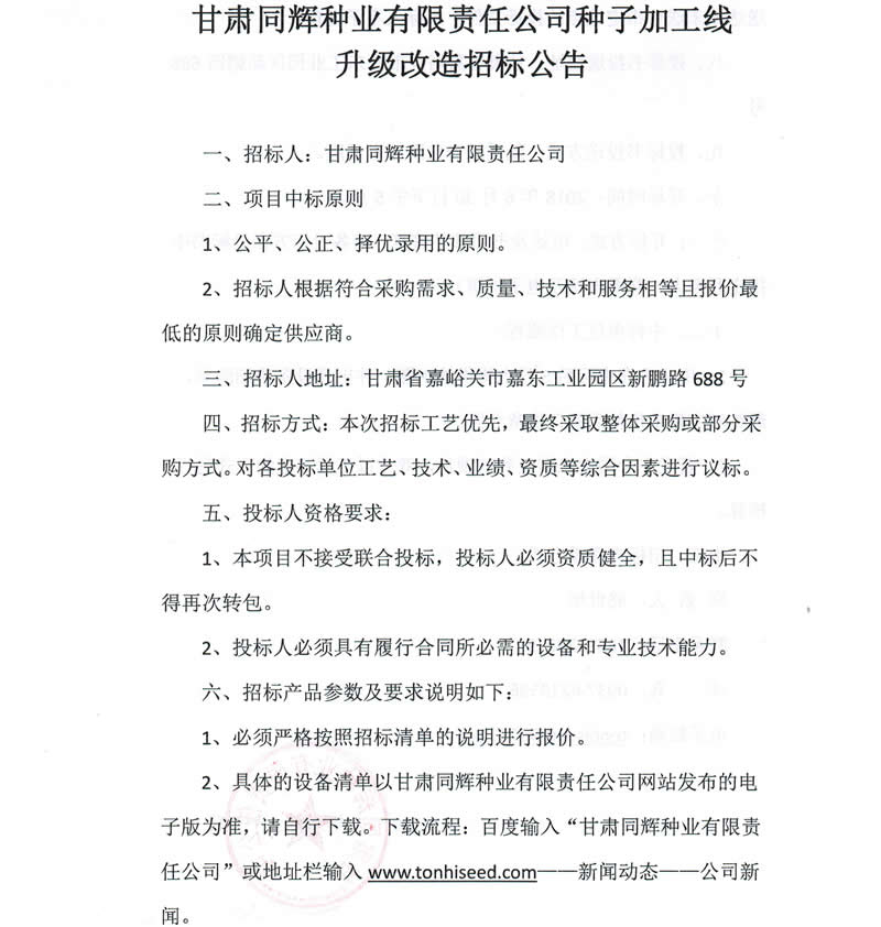 一、招標人:甘肅同輝種業(yè)有限責任公司