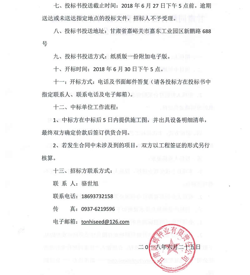 七、投標書投送截止時間:2018年6月27日下午5點前。逾期送達或未送達指定地點的投標文件,招標人不予受理。