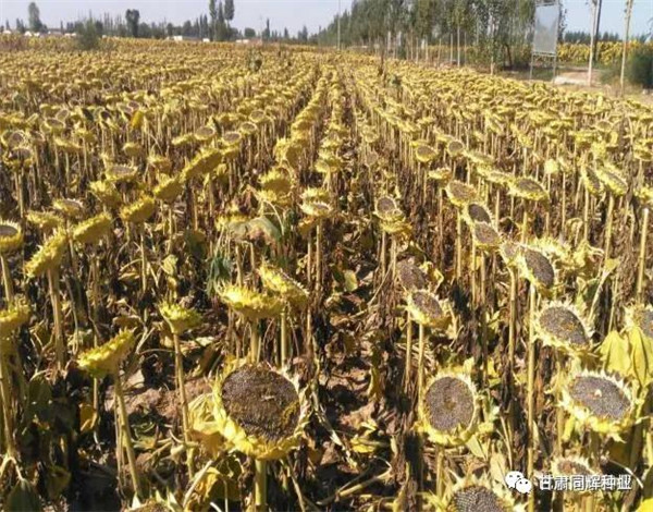 向日葵植株莖桿變黃,大部分葉片枯黃脫落,花盤(pán)背面成黃褐色,舌狀花干枯或脫落,籽粒變硬(即含水率30%),并呈現(xiàn)固有色澤,此時(shí)達(dá)到生理成熟階段,是收獲的適宜時(shí)期,可以割盤(pán)晾曬或插盤(pán)晾曬。