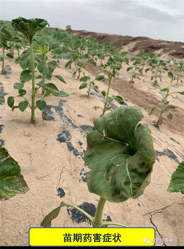 選擇向日葵地塊時(shí),需掌握前茬作物除草劑使用情況,若存在藥害殘留風(fēng)險(xiǎn),最好不列入向日葵種植計(jì)劃。確需種植向日葵的風(fēng)險(xiǎn)地塊,出苗水需使用解毒劑萘安,可在一定程度分解土壤中殘留的除草劑成分,起到減輕藥害的作用。