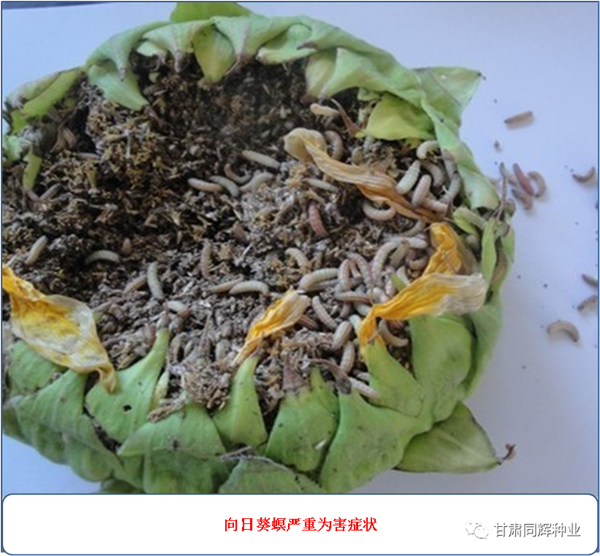 向日葵螟又叫葵螟,以幼蟲為害花盤、萼片和籽粒,花盤被害率一般在20~50%,重者100%;籽粒被害率一般在10%以上,重者達80%以上。受害花盤一般有幼蟲1~5頭,最多達100多頭。幼蟲蛀入花盤吃掉種仁,并蛀成許多隧道,還將咬下的碎屑和糞便填充隧道里造成污染,遇雨后造成花盤及籽粒發(fā)霉腐爛,不但嚴重影響產(chǎn)量,同時還嚴重影響葵花商品性。目前,葵螟已成為西北向日葵產(chǎn)區(qū)最為主要的蟲害之一,并且蟲害逐年加重趨勢明顯,給向日葵生產(chǎn)造成很大的經(jīng)濟損失,因此必須高度重視葵螟的防治工作!