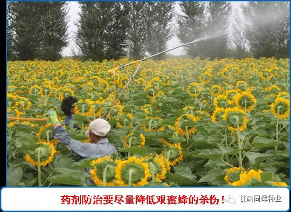 6.2 如果田間蟲害嚴重必須在開花期進行殺蟲操作,盡量不使用對蜜蜂傷害小的藥劑(菊脂類),并注意避開蜜蜂及昆蟲活動活躍時段,在陰天或下午5:00后對準葵盤正面進行噴藥,以降低對傳粉昆蟲的傷害;