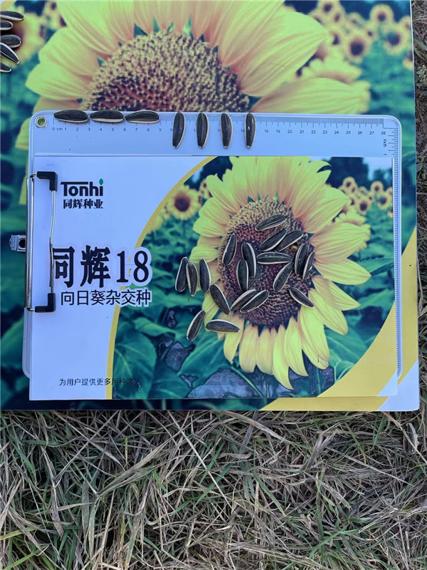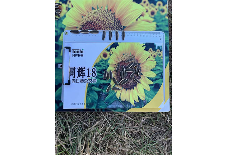 食葵,中早熟品種,平均生育期101天。株高160厘米左右,平均盤(pán)徑24厘米,花盤(pán)傾斜度4級(jí),結(jié)實(shí)率62%,葉色中綠,花盤(pán)平整,籽;业装走,平均粒長(zhǎng)2.45厘米,寬0.95厘米。